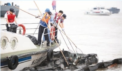 江苏省扬州市,人们在清理长江仪征段江面上漂浮的垃圾。孟德龙摄