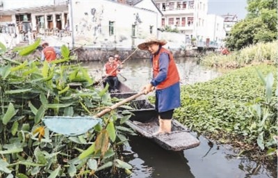 浙江省湖州市德清县雷甸镇雷甸村的河长,正在清理河面漂浮物。姚海翔摄